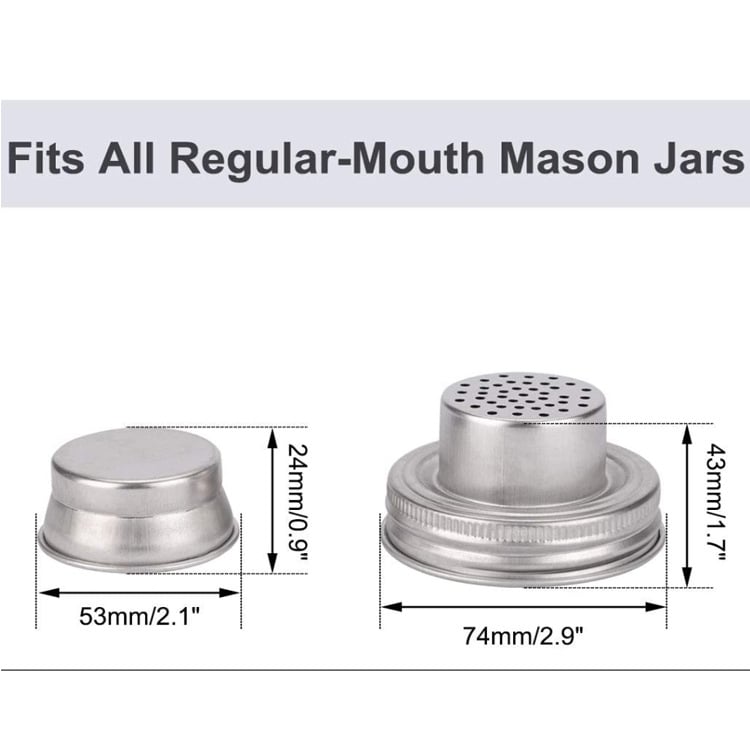 LEAKPROOF - Our Mason jar lids edges have ribbing for anti slip easy grip, easy open and tighten.·These Stainless Steel Mason jar Shaker Lid with silicone seals for regular mouth mason jars ,Lids fit most of regular mouth (74mm/2.9 inch) mason jar.not fit wide mouth mason jars.