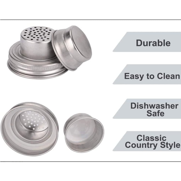 MATERIAL - The stainless steel mason jar spice lid made of 304 stainless steel,sturdy and has long time to use,food grade sealing silicone gasket.